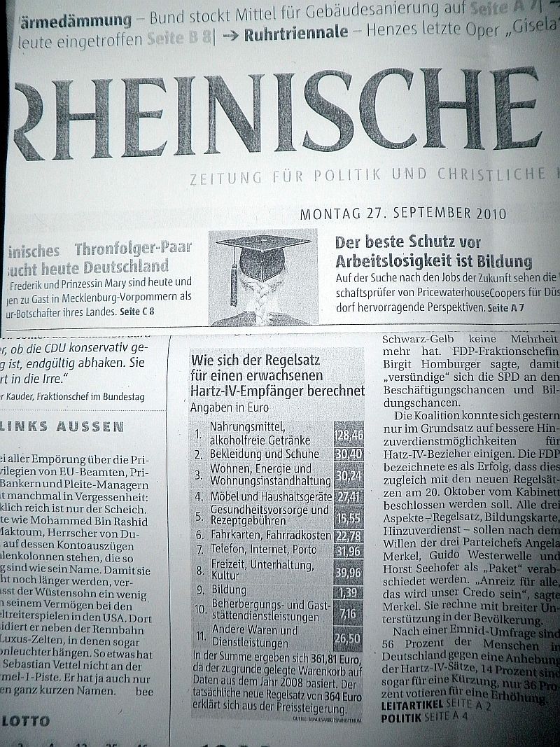 Ich weiß nicht, ob Sie das auf Ihrem Monitor erkennen können: Die Rheinische Post titelt mit einem Artikel über die weiteren Hartz IV Reformen und schlüsselt den neuen Regelsatz auf. Dort wird aufgeführt, dass einem Bürger, der monatliche Regelleistungen von künftig 364 Euro erhält, davon 1,39 für Bildung zur Verfügung stehen. Das reicht nicht mal für einen Jahresausweis der Bibliothek, geschweige denn für 2 Tagesausgaben der Rheinischen Post (wahlweise einer anderen Tageszeitung).