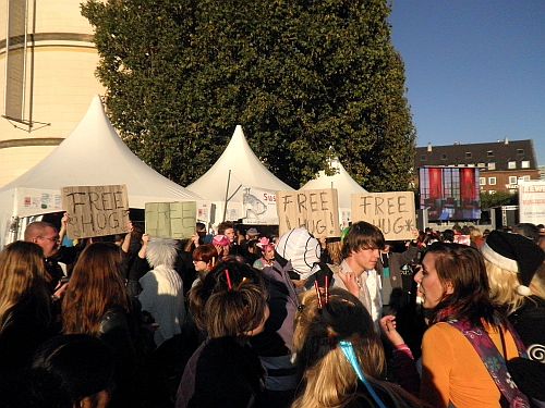 Während man in Düsseldorf kostenlose Umarmungen anbietet, demonstrieren in Europa Menschen gegen den Missbrauch der Steuergelder von Banken. Wortdiskussionen, ob Griechenland „pleite“, „insolvent“ oder sonst etwas sind, sind Makulatur. Schließlich ist weltweit sonnenklar, dass Geld nicht verdunstet, sondern denen weiter zufließt, die es in den Sand gesetzt haben, und BürgerInnen sollen dafür darben.